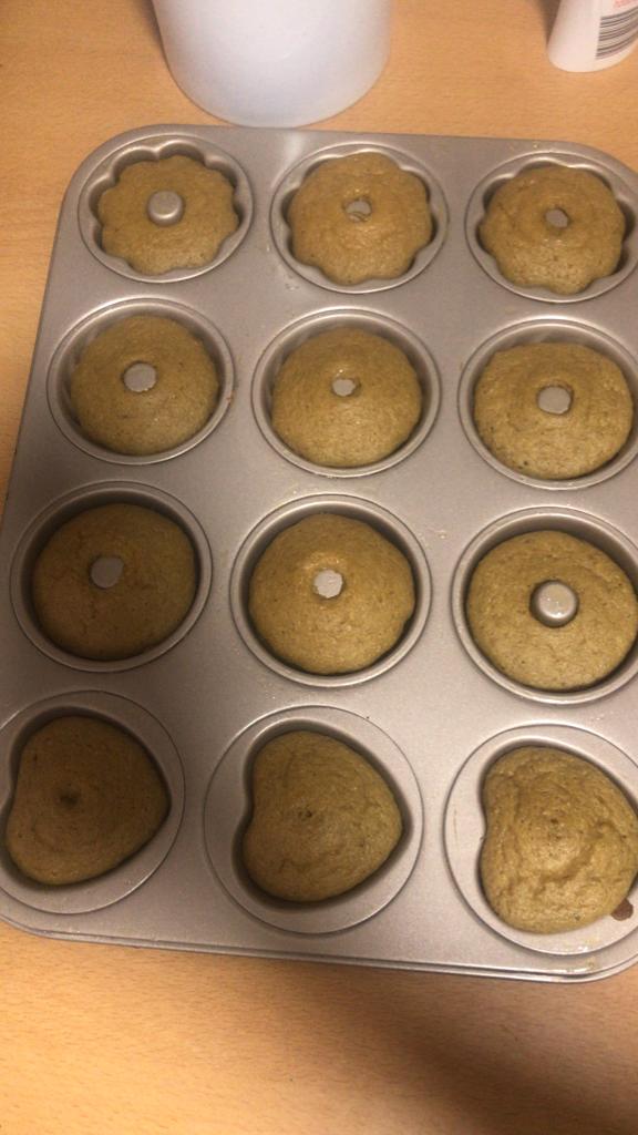 Todos los ingredientes en el vaso en modo triturar hasta que quede una mezcla homogénea. Después repartiremos en los moldes previamente engrasado con un poco de aceite de coco, de oliva, o con lo que prefiráis y a el horno 20segundos a temperatura 180grs